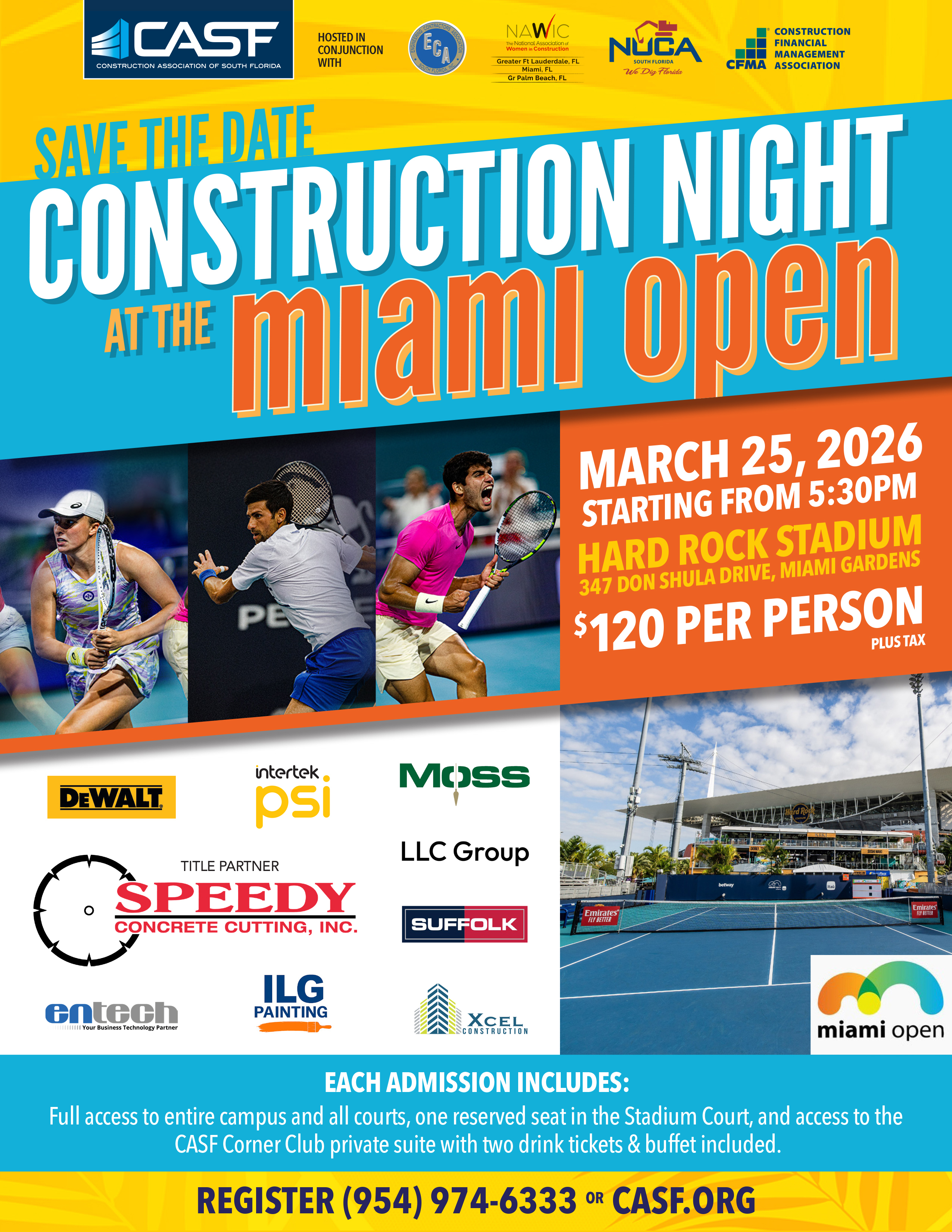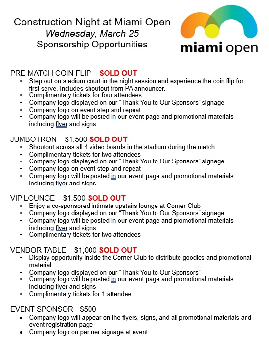 CASF will be hosting a Construction Night at the Miami Open! 🏗️🎾 Join us for an evening that brings together industry professionals, networking opportunities, and world-class tennis!